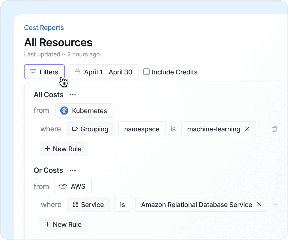 Give teams the ability to see their Kubernetes costs alongside shared out-of-cluster costs from AWS, GCP, Oracle, or Azure in a single cost report.