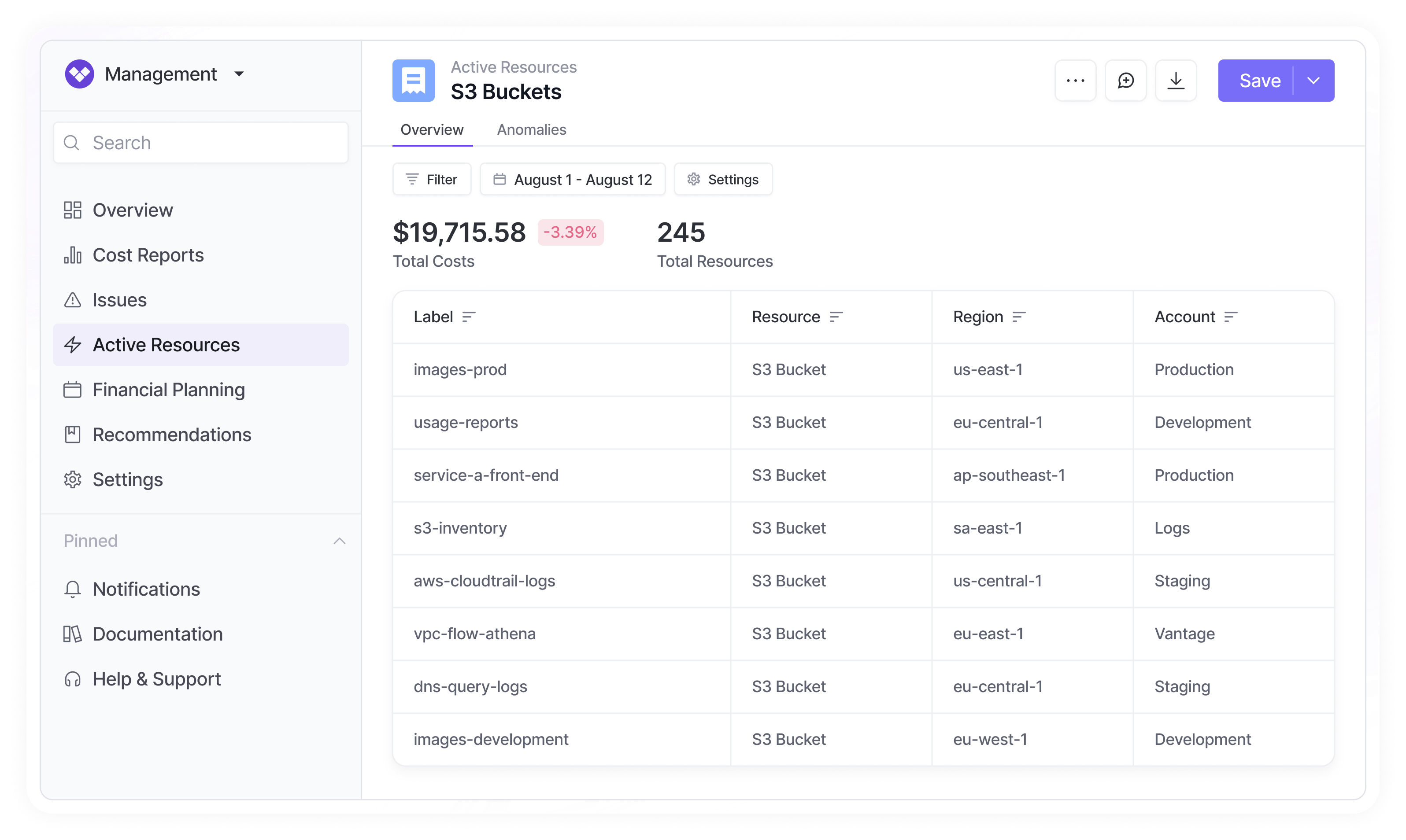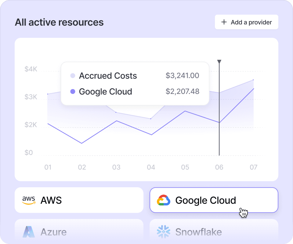 Vantage integrates with service APIs to show you a snapshot of all active resources driving costs. Get a full inventory of every offending resource.