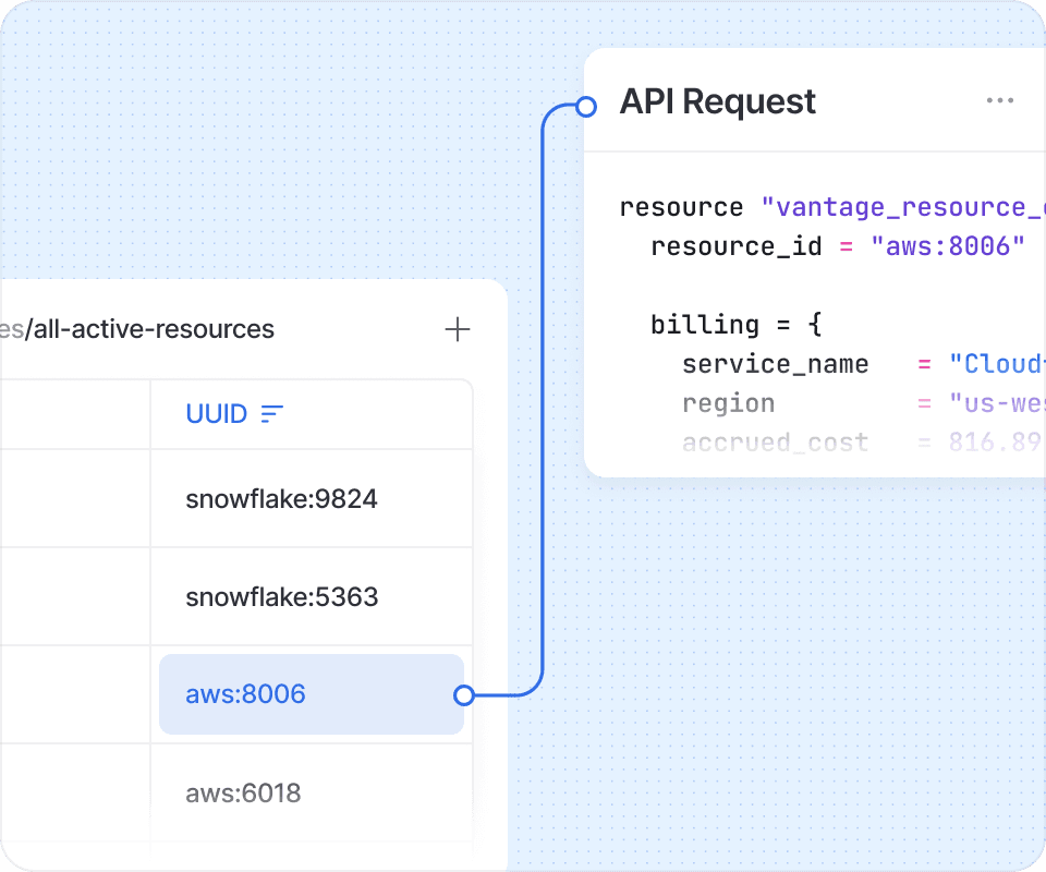 Billing data is notoriously light. Vantage automatically enriches IDs or hashes found in cost and usage report data with metadata from service APIs to help make sense of what’s happening.
