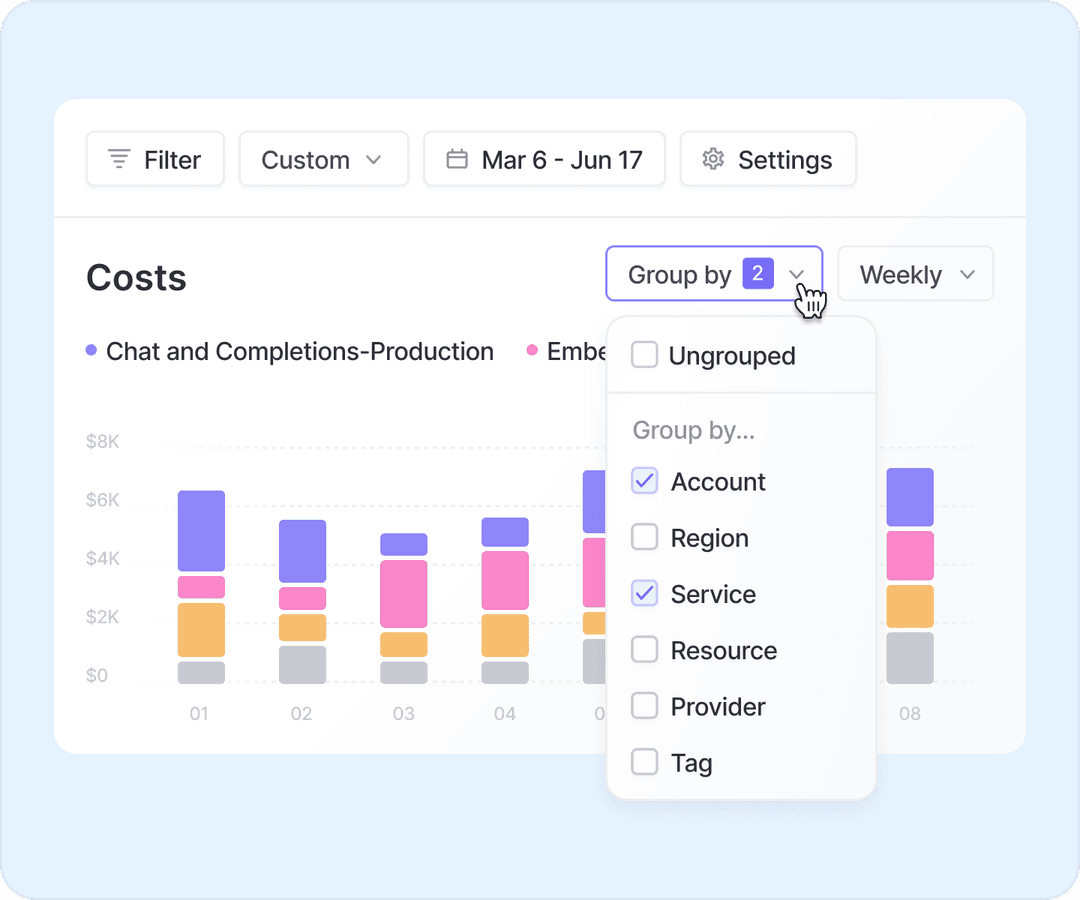 View spend by model, service, like Chats and Completions, Images, or Embeddings, and more. Allocate spend by billing account, organization, or project for complete visibility and control.